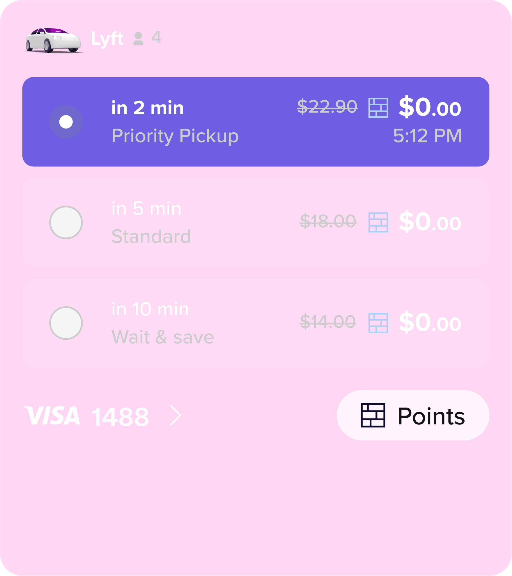 Once your Bilt and Lyft accounts are linked, you’ll be able to pay for all or part of your Lyft rides with your Bilt Points, directly in the Lyft app. To use your points, just tap the Points button when booking a ride.